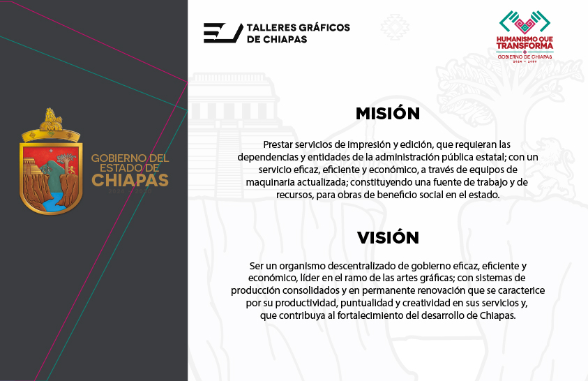 Talleres Gráficos de Chiapas, es un organismo gubernamental reconocido para realizar servicios de impresión de calidad, cuenta con una amplia experiencia, profesionalismo, así como personal altamente capacitado e instalaciones de primer nivel. Es un Organismo Público, especializado en las artes gráficas y que brinda sus servicios al sector público.